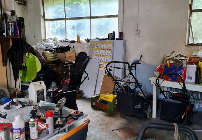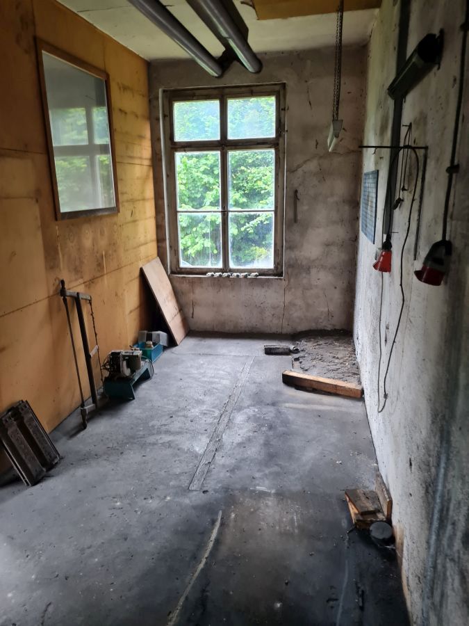 Naturstein, Fliesen, Teppich und PVC Doppelisolierverglasung aus Kunststoff und Holz Werkstatt mit Heizung und zwei Wasseranschlüssen.